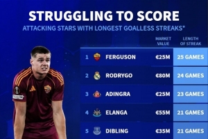 德轉(zhuǎn)盤點進(jìn)攻球員進(jìn)球荒(身價2500萬歐+):