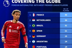 體育資訊10月27日訊 《轉(zhuǎn)會市場》統(tǒng)計了當前英超的各國外援數(shù)量,法國球員多達40人。