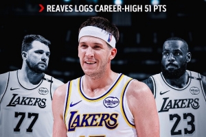 今天里夫斯21投12中,三分10中6,罰球22中21砍下51分11籃板9助攻,正負(fù)值+22,刷新各種紀(jì)錄,助湖人客場127-120力克國王。