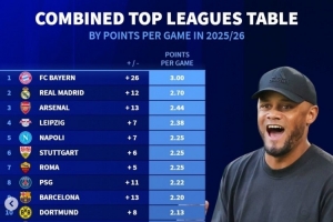 體育資訊10月28日訊 《轉會市場》更新了本賽季五大聯(lián)賽球隊的場均拿分情況,拜仁、皇馬、阿森納分列前三。
