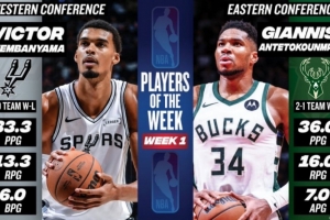 體育資訊10月28日訊 NBA官方宣布,字母哥和文班亞馬分別當(dāng)選了東西部第一周的周最佳球員。