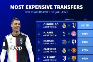 體育資訊10月29日訊 德轉(zhuǎn)盤點(diǎn)了足壇歷史30歲及以上球員轉(zhuǎn)會(huì)費(fèi)紀(jì)錄榜,其中C羅33歲加盟尤文以1.17億歐居首,凱恩加盟拜仁次席,內(nèi)馬爾9000萬(wàn)歐第三。