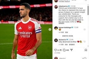 梅里諾寫道:“自豪與榮幸!今晚能有機會作為隊長代表這家俱樂部和這群球員出戰(zhàn),感覺難以置信。感謝所有人的留言和支持,沒有比用一場勝利和晉級下一輪更好的方式來慶祝了,槍手加油!????????”