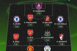 中場:薩卡(阿森納)、賴斯(阿森納)、吉馬良斯(紐卡斯?fàn)枺⑷纺釆W(伯恩茅斯)
