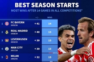 體育資訊10月31日訊 拜仁在昨晚德國杯4-1逆轉(zhuǎn)科隆,賽季開局各項(xiàng)賽事14場(chǎng)全勝打破五大聯(lián)賽球隊(duì)歷史紀(jì)錄,《轉(zhuǎn)會(huì)市場(chǎng)》也統(tǒng)計(jì)了五大聯(lián)賽球隊(duì)歷史單賽季各項(xiàng)賽事前14場(chǎng)的勝場(chǎng)情況。