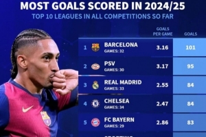 體育資訊1月27日訊 本賽季歐陸賽程已經(jīng)過半,《轉(zhuǎn)會市場》也統(tǒng)計了歐洲前十聯(lián)賽俱樂部的各項賽事總進(jìn)球榜,巴薩居首。
