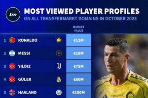 體育資訊11月2日訊 德國(guó)轉(zhuǎn)會(huì)市場(chǎng)列出了10月份球員頁(yè)面瀏覽量排名,C羅居首,梅西、伊爾迪茲二三位。