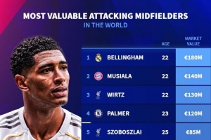 體育資訊11月2日訊 德國轉(zhuǎn)會市場列出了進攻型中場身價排名,貝林厄姆1.8億歐居首,穆西亞拉1.4億歐次席。