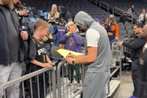 太陽(yáng)球員努爾基奇賽前耐心與小球迷交流并簽名,目前他已經(jīng)連續(xù)九場(chǎng)比賽沒(méi)有獲得上場(chǎng)機(jī)會(huì)。