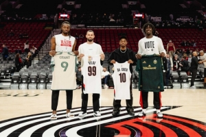 體育資訊11月4日訊 美職聯(lián)波特蘭伐木工隊(duì)球員大衛(wèi)-達(dá)-科斯塔、維爾德在美職聯(lián)季后賽間隙到主場支持開拓者。球隊(duì)也由格蘭特、西索科做代表送出了定制球衣。