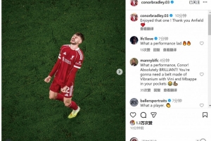 布拉德利當(dāng)選本場(chǎng)比賽利物浦隊(duì)內(nèi)最佳球員,賽后他在社交媒體上曬出照片,配文:“享受這場(chǎng)比賽,謝謝安菲爾德?!?/p>