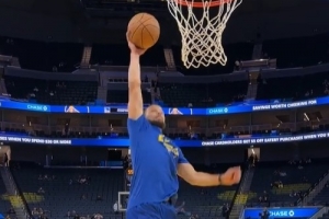 賽前,勇士球星庫(kù)里進(jìn)行熱身,自拋?zhàn)钥弁瓿蓡问挚刍@。