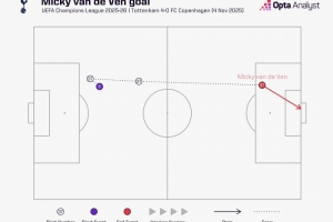 據(jù)Opta統(tǒng)計,范德芬?guī)蚺軇?7.7米之后破門,這是2015年Opta統(tǒng)計相關(guān)數(shù)據(jù)以來,歐冠帶球距離最遠的進球。