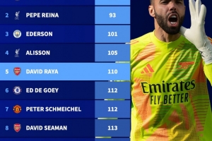 英超門將最快50場零封排行榜:拉亞躋身前五,切赫和雷納排名一二