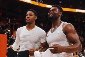 NBA常規(guī)賽,猛龍隊(duì)113-104戰(zhàn)勝鵜鶘隊(duì)。賽后,錫安和巴雷特交換了球衣。