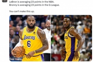 美媒NBA Memes:詹姆斯本賽季在NBA場均23分(實則23.6)、布朗在G聯(lián)盟場均23分(3場),這編都編不出來。