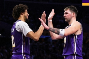 賽后湖人官方曬出本場贏球海報(bào),東契奇和海斯擊掌照登上封面。