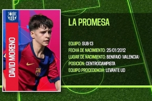 大衛(wèi)-莫雷諾是巴薩青訓(xùn)營(yíng)中最具潛力的球員之一。上賽季,他成為了巴薩所有11人制球隊(duì)中最耀眼和最令人矚目的球員。這名左腳中場(chǎng)將在明年1月25日年滿14歲,2023-24賽季從萊萬(wàn)特加盟后,他已經(jīng)在巴薩青訓(xùn)營(yíng)度過(guò)了兩個(gè)輝煌的賽季。