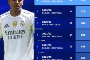 德國(guó)轉(zhuǎn)會(huì)市場(chǎng)盤點(diǎn)了羅德里戈加盟皇馬后7個(gè)賽季同期出場(chǎng)數(shù)據(jù),本賽季他盡管出戰(zhàn)了12場(chǎng)比賽,但出場(chǎng)時(shí)間僅為348分鐘。在這個(gè)過程中,他送出了兩次助攻。