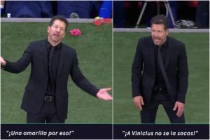在一次犯規(guī)判罰之后,鏡頭拍到了馬競主帥西蒙尼正在對(duì)主裁曼薩諾抗議:“嘿!你在吹什么!冷靜點(diǎn)!就為了這個(gè)出牌?”西蒙尼最后又搖著頭說:“你不敢對(duì)維尼修斯出牌。”然后他又盯著第四官員重復(fù)了一遍這句話。