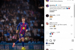 奧爾莫社媒曬出比賽照片,配文:“非常重要的三分,巴薩球迷們,咱們休賽期之后見,加油巴薩!”