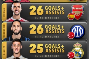 2025年五大聯(lián)賽中場球員參與進(jìn)球榜: