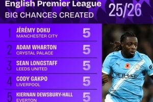 體育資訊11月11日訊 英超聯(lián)賽已經(jīng)進行了11輪,squakwa也統(tǒng)計了本賽季英超創(chuàng)造重大機會情況,多達8人并列居首。