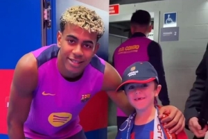 體育資訊11月11日訊 巴薩上周五在諾坎普進(jìn)行了公開(kāi)訓(xùn)練,阿勞霍帶著一位患病小球迷見(jiàn)亞馬爾。