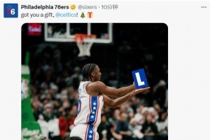 76人官方賽后整活,曬出馬克西手持“L(lose)”的P圖寫道:“給你個圣誕禮物@凱爾特人?????!?/p>