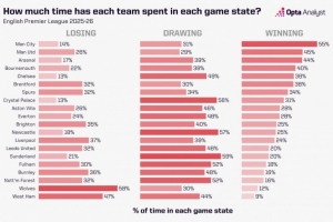 體育資訊11月12日訊 本賽季英超已經(jīng)結(jié)束了11輪的爭奪,OPTA統(tǒng)計了各隊處在領(lǐng)先、落后以及均勢時間占比情況,其中曼城平均每場比賽領(lǐng)先時間最長,達到總比賽時間的55%,而水晶宮和切爾西平均每場處在落后情況下的比賽時間最短,僅為總比賽時間的13%。