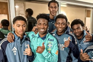 維尼修斯隨巴西隊在阿森納基地訓(xùn)練,備戰(zhàn)這場友誼賽,他與阿森納的青訓(xùn)球員合影。