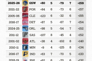 據(jù)統(tǒng)計(jì),勇士本賽季至今12場(chǎng)比賽,主場(chǎng)凈勝對(duì)手80分,客場(chǎng)凈負(fù)79分,主客場(chǎng)凈勝分差值達(dá)到159,創(chuàng)下了本世紀(jì)以來(lái)所有球隊(duì)賽季前12場(chǎng)比賽的最懸殊紀(jì)錄。