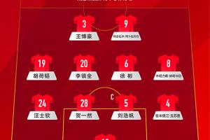 U22國(guó)足首發(fā):12-霍深坪、19-胡荷韜、4-吾米提江、5-劉浩帆、24-汪士欽、28-賀一然、3-王博豪、6-徐彬、20-李鎮(zhèn)全、8-木塔力甫、9-拜合拉木