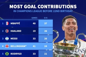 體育資訊1月29日訊 德國轉(zhuǎn)會市場統(tǒng)計了球員22歲生日之前在歐冠比賽中的參與進(jìn)球數(shù)量,并列出榜單,姆巴佩、哈蘭德、梅西、貝林厄姆排名前四,其中貝林厄姆今年6月年滿22歲,仍有機(jī)會沖擊更高的排名。