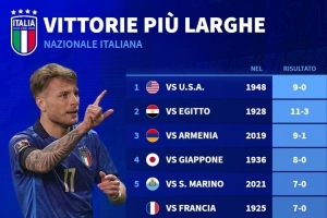 體育資訊11月14日訊 北京時間11月17日凌晨,意大利將在世預賽最后一輪比賽中主場對陣挪威,意大利此役需要至少凈勝挪威9球,才能直接出線。德國轉會市場列出了意大利隊史最大比分勝利榜單。