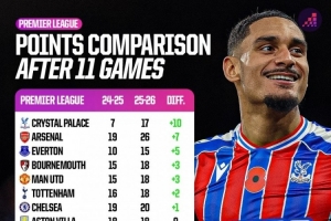 體育資訊11月14日訊 Opta統(tǒng)計(jì)了英超球隊(duì)本賽季前11輪比賽與上賽季同期積分的變化,并列出榜單,水晶宮+10分提升最大,阿森納+7分,利物浦-10分。
