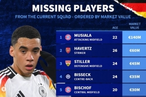 體育資訊11月15日訊 德轉列德國落選本次國家隊名單的球員身價排行,穆西亞拉1.4億歐居首,哈弗茨6000萬歐第二,斯蒂勒4500萬歐第三。