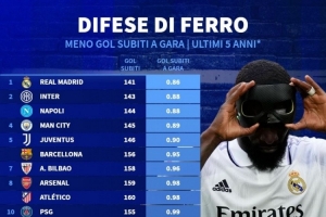 體育資訊11月15日訊 德國轉會市場統(tǒng)計了2020-2021賽季以來球隊在五大聯(lián)賽中的場均失球,并列出場均失球最少榜單,皇馬0.86球居首,國米、那不勒斯前三。
