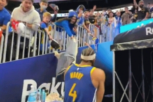 賽后,勇士球員穆迪和波杰姆斯基在進入球員通道前,將自己的裝備脫下扔給球迷。