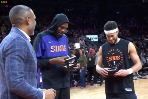 體育資訊1月29日訊?昨天太陽的比賽,美國男籃總經(jīng)理格蘭特-希爾向杜蘭特和布克頒發(fā)了巴黎奧運會的冠軍戒指。