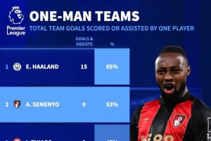 體育資訊11月18日訊 德國轉會市場統(tǒng)計了球員本賽季英超參與進球數(shù)量占據(jù)球隊總進球的比例,并列出榜單,哈蘭德占比65%最高,塞梅尼奧占比53%第二。
