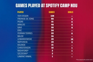 在當前陣容中,五位隊長中的四位占據(jù)了隊內諾坎普球場出場次數(shù)榜的前列:特爾施特根、弗蘭基·德容、佩德里和阿勞霍。