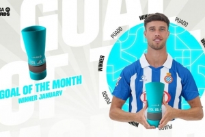 體育資訊1月29日訊 西甲官方宣布,西班牙人前鋒普阿多的凌空抽射當(dāng)選西甲1月最佳進(jìn)球。