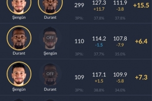 杜蘭特在場而申京不在場時,火箭進攻效率114.2,防守效率107.8,凈效率+6.4;