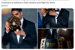 體育資訊11月20日訊 阿什拉夫當選2025年非洲足球先生,他在社交媒體上曬出領(lǐng)獎?wù)掌l(fā)表獲獎感言。