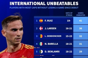 體育資訊11月20日訊 德國(guó)轉(zhuǎn)會(huì)市場(chǎng)統(tǒng)計(jì)了本世紀(jì)球員國(guó)家隊(duì)首秀之后的連續(xù)不敗場(chǎng)次數(shù)據(jù),并列出榜單,法比安·魯伊斯連續(xù)41場(chǎng)不敗居首。