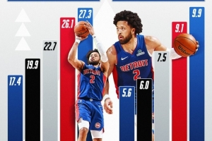 體育資訊11月21日訊 NBA官方曬出了康寧漢姆五個賽季以來的得分、助攻數(shù)據(jù)的提升表現(xiàn)。