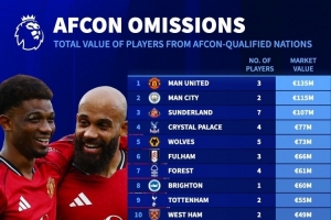 體育資訊11月21日訊 德國轉(zhuǎn)會(huì)市場(chǎng)統(tǒng)計(jì)了英超各隊(duì)將參加非洲杯球員的身價(jià),并列出排名,曼聯(lián)1.35億歐居首,曼城1.15億歐次席。