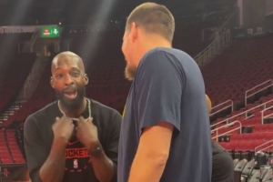 賽前,掘金球星約基奇在場(chǎng)邊和火箭老將杰夫·格林熱聊一波,雙方曾在掘金當(dāng)過(guò)隊(duì)友。