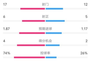 全場比賽數(shù)據(jù)如下(曼城在前):